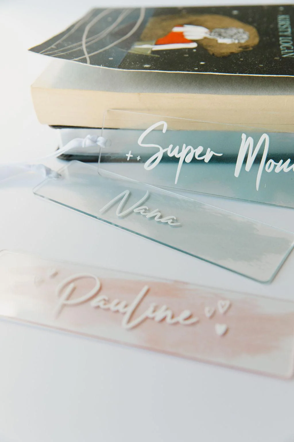 Personalised acrylic book mark with a blush pinkĀ uv print and text of your choice. Finished off with a white satin ribbon.Ā