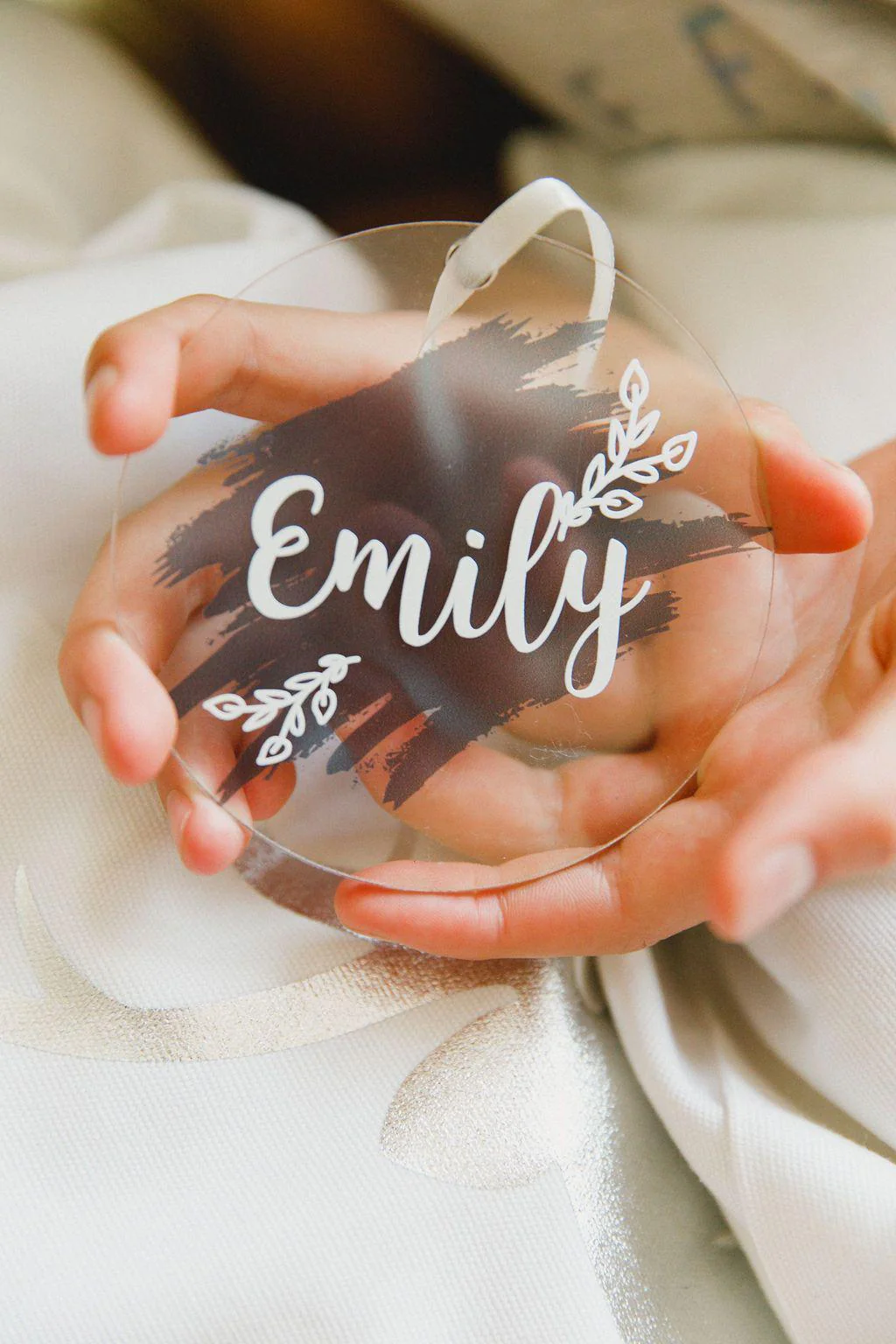 Beautiful clear acrylic Christmas decorations, with a brushed grey print and personalised name.