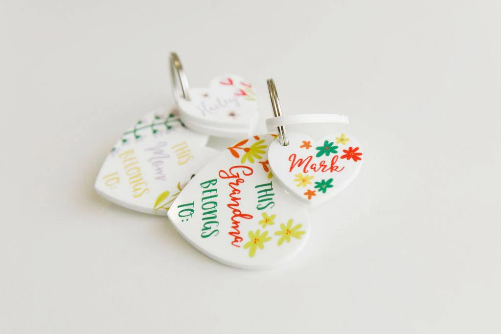 Personalised acrylic key ring for a special Granny, including a big heart for her and smaller hearts with all her children / grandchildren's names.