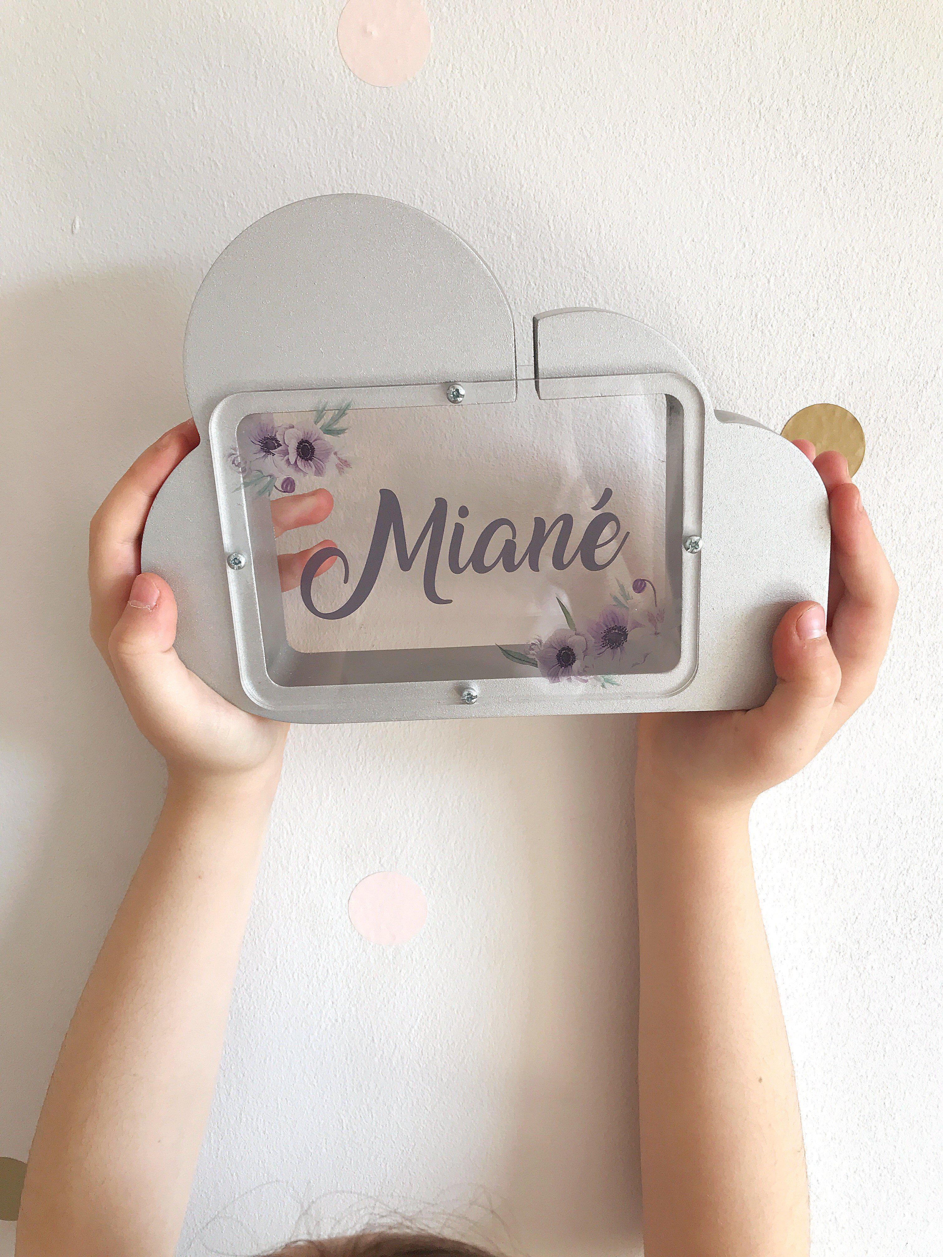 This beautiful wooden money box is painted in the colour of your choice, and personalised with your little ones' name UV printed onto the window.